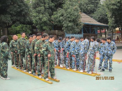 接著,我們進行了“無軌電車”,每組所有的隊員站到兩條木板上,提起所有的繩子,由起點出發(fā)到達終點為一輪。開始大家都很不協(xié)調(diào),畢竟一組的人員需要很好的節(jié)奏配合才能順利走到終點線。大家都認真地想辦法、溝通好,團結(jié)一致共同邁出整齊的步伐。